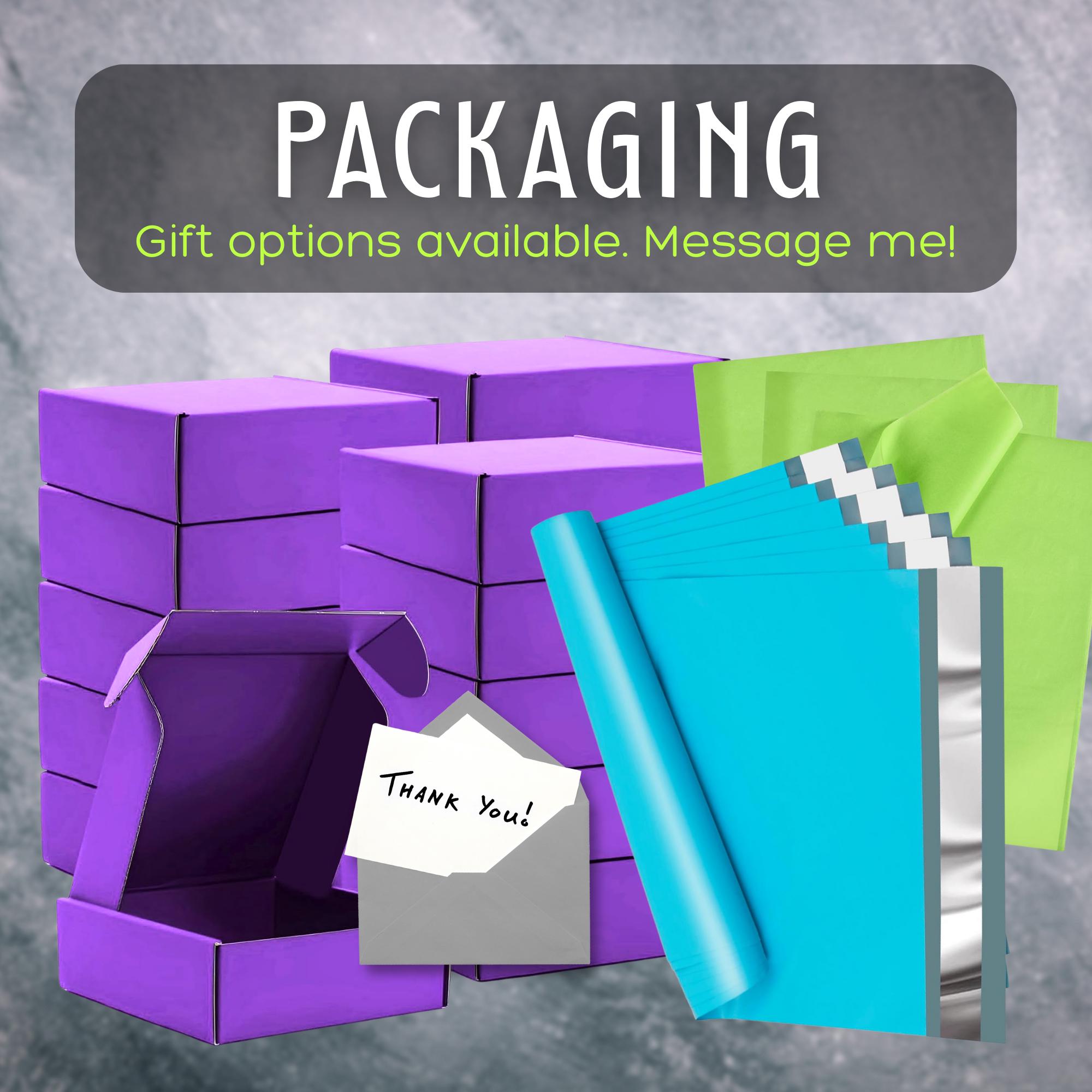 All orders come packaged in holographic bags inside poly mailers or boxes, depending on the order size. Send me a message if your order is a gift and you'd like a custom notecard included in the packaging!