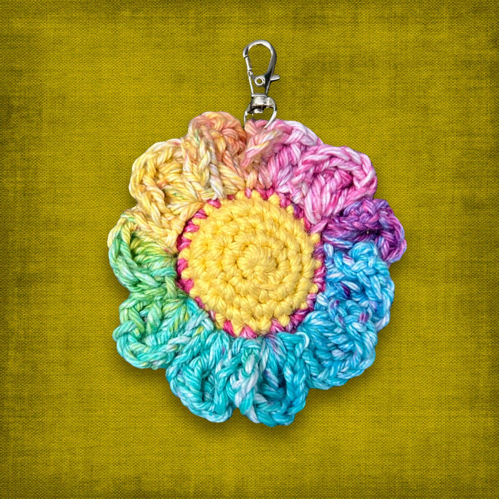 🟣 This bag charm keychain is made from 100% cotton yarn and includes a silver clip. The flower is rainbow in color with a bright yellow center. It measures approximately 3.5IN or 9CM across, not including the clip. Easily attach this cute charm to your keys, purse, backpack, or anywhere else that makes you smile.
