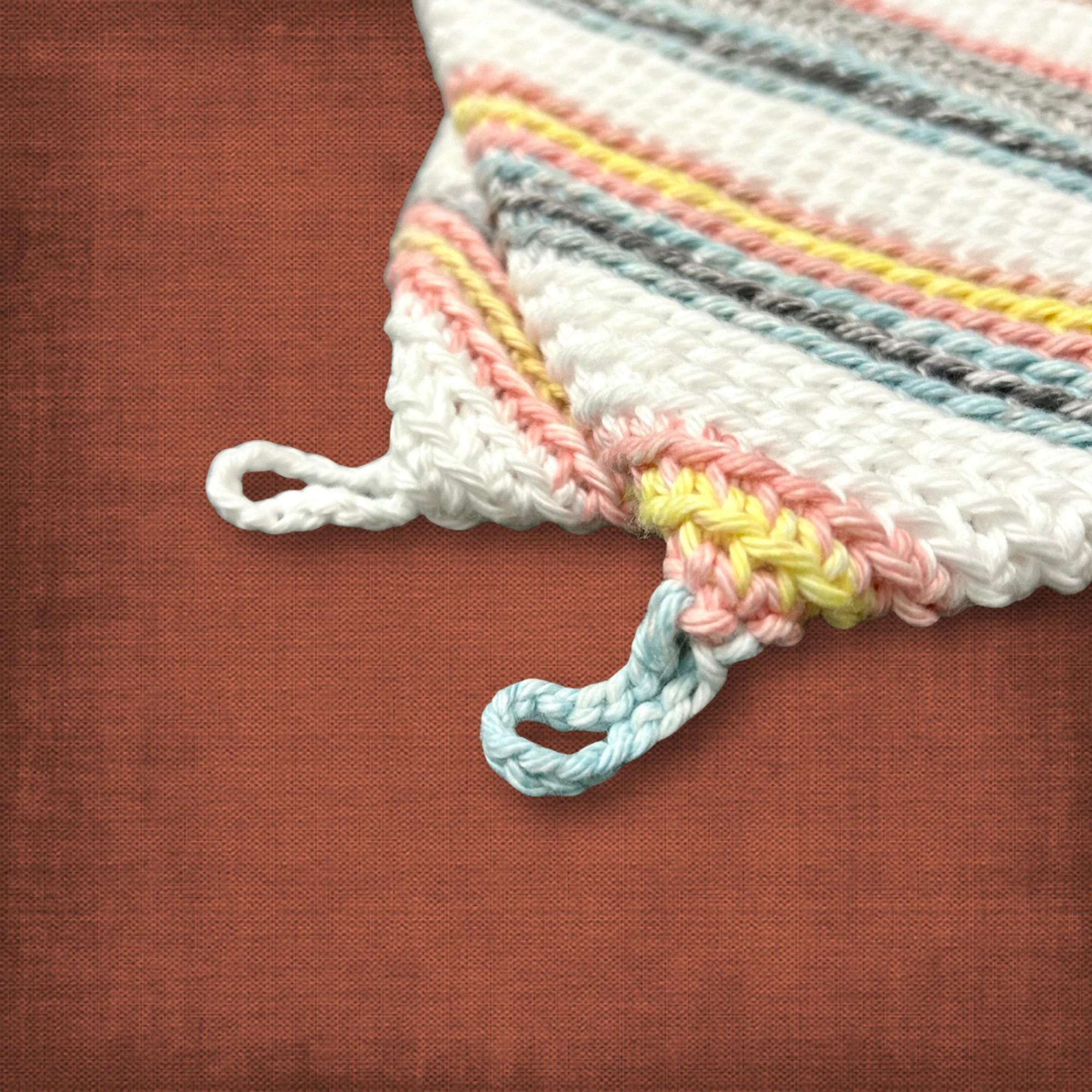 🟣 These 100% cotton kitchen pot holders are double-sided and safe to use with hot stove and oven items. The colors are white and pastel rainbow with soft pink, baby blue, light gray, and yellow. Each pot holder measures approximately 7.5 IN or 19 CM on each side, making a square. The attached hanging rings are roughly 1.5 IN or 4 CM in height. Yes, you're receiving two pot holders with this listing! Hang them on your kitchen hooks or cabinet door handles for easy access when cooking.