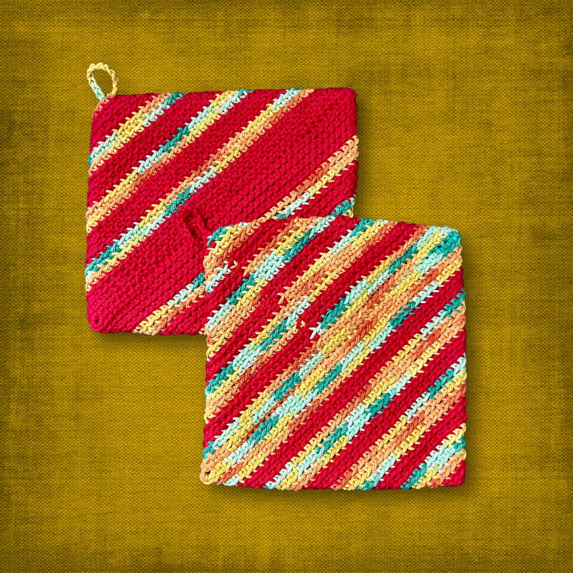 🟣 These pot holders were handmade by me, Melissa Jane, using a crochet pattern inspired by "Play Hooky with Me." I've been crocheting since 1991 after learning the craft from my great-grandmother. It means so much to me to carry on a family tradition and share it with the world!