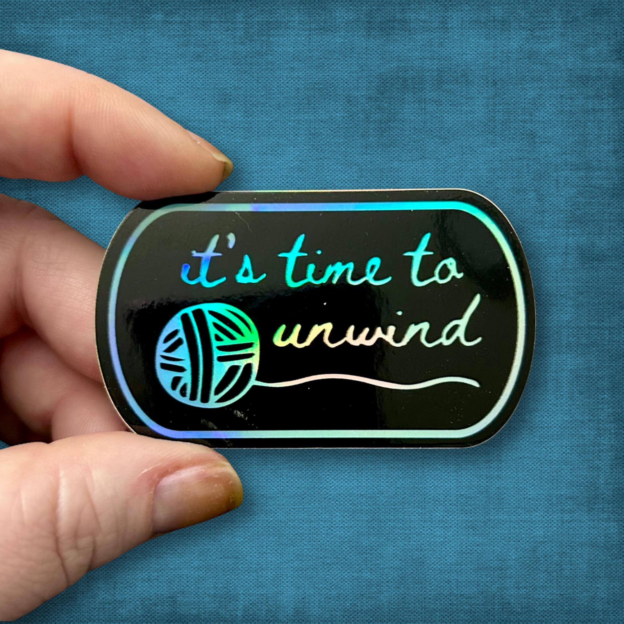 🟣 This holographic vinyl sticker features a yarn ball and says, "it's time to unwind." It measures 3 x 2 IN or 7.5 x 5 CM. The holographic sheen has an eye-catching rainbow effect that changes with light and perspective. The design is aqua blue and turquoise green in color. The thick, durable vinyl protects the stickers from scratches, water, and sunlight. It's even dishwasher safe!