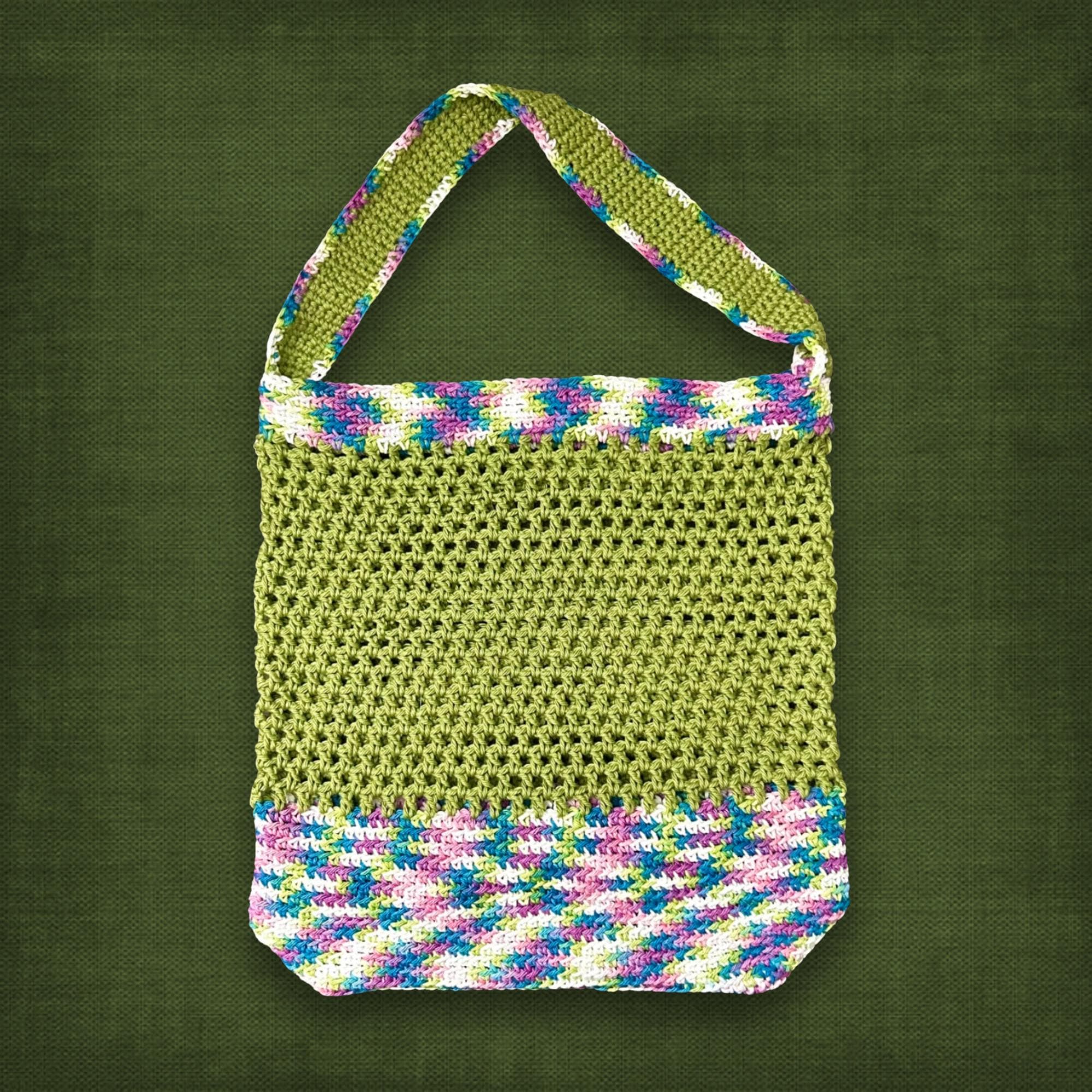 🟣 This soft cotton mesh bag is perfect for local markets. The bag expands to fit all your goodies! It's an environmentally friendly statement that says you support handmade artisans. This market bag's mesh body is a mossy green with a multicolor trim in white, blue, and purple. The strap also stretches to accommodate any size arm (see photos for all measurements). It's machine washable since it's made from 100% cotton yarn.