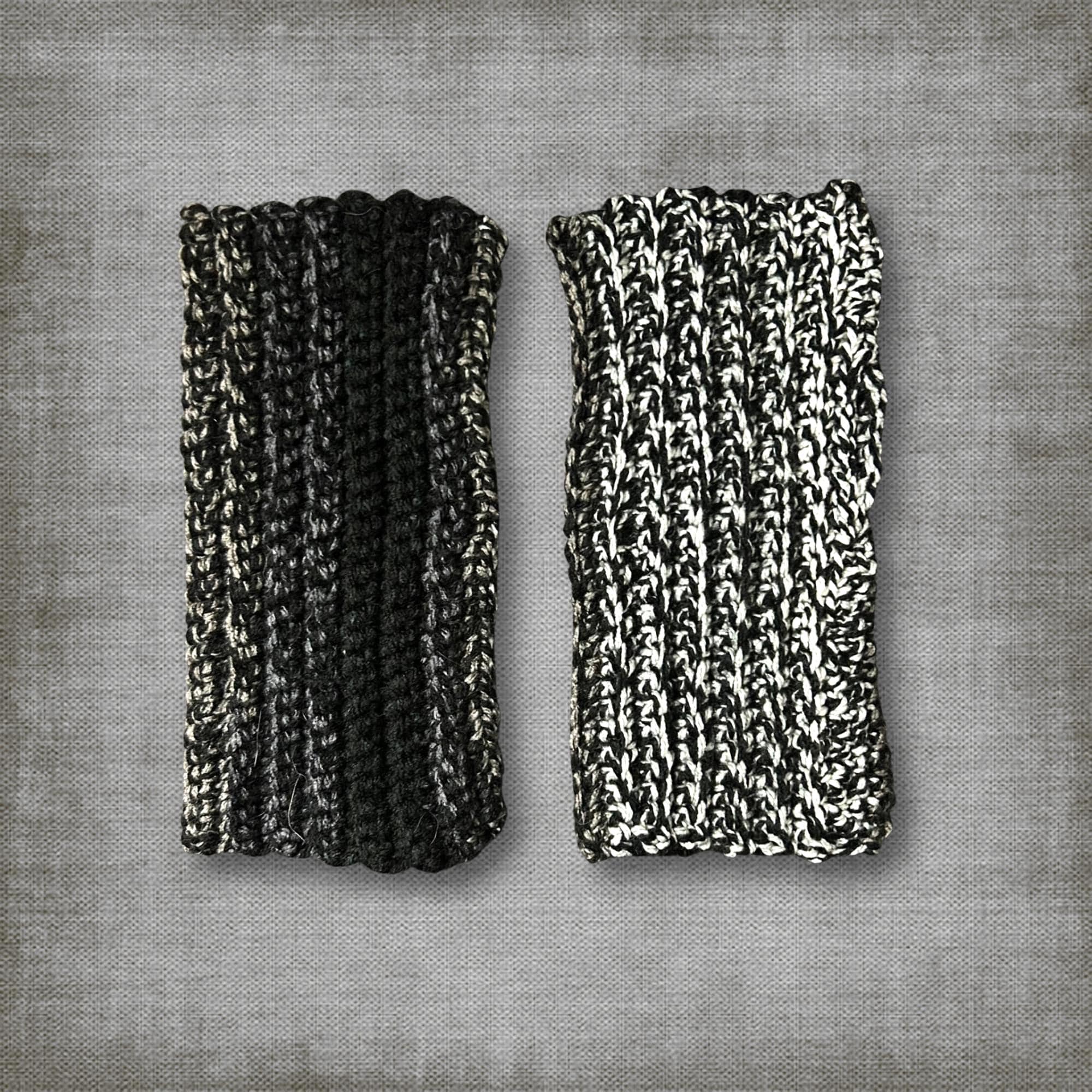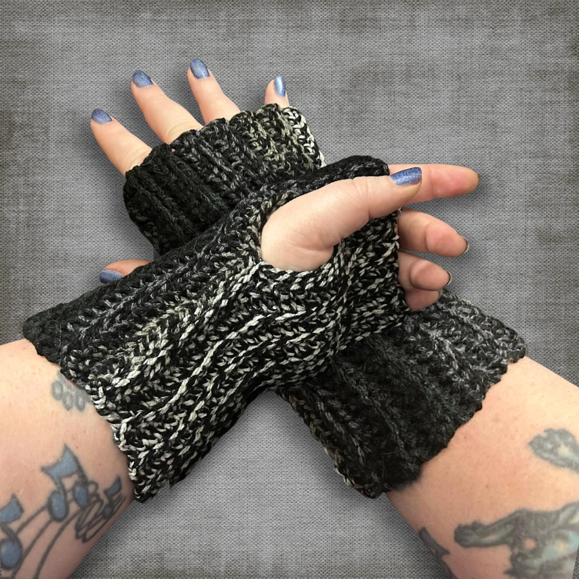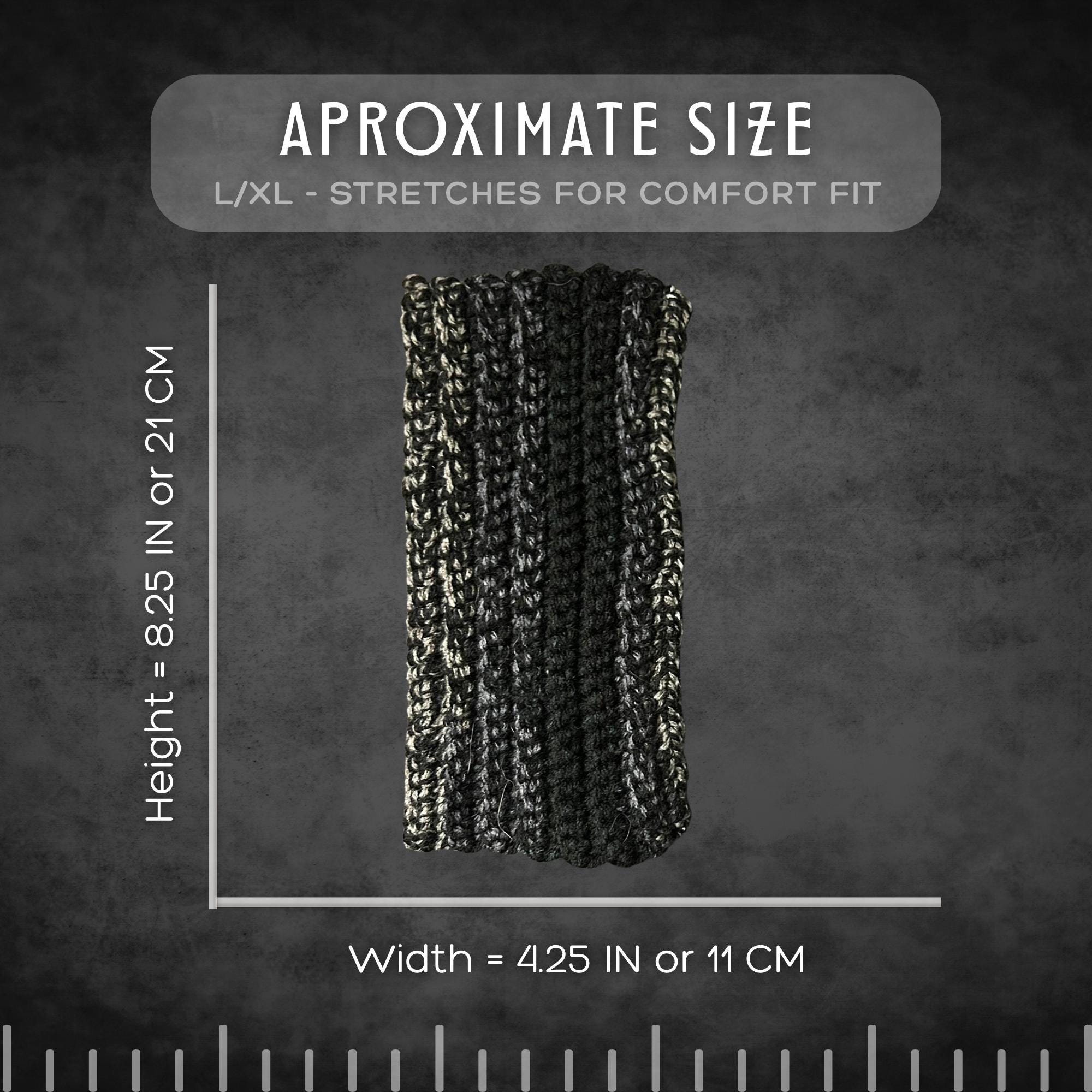 🟣 These super soft wrist warmers are an adult size L/XL. For reference, my wrists are 8.25 IN around. I used a ribbed pattern so the gloves have a comfort stretch when worn. They're black, white, and gray and great for anyone with cold hands and wrists (like your friends who use computers or cell phones all day)! See photos for measurements.