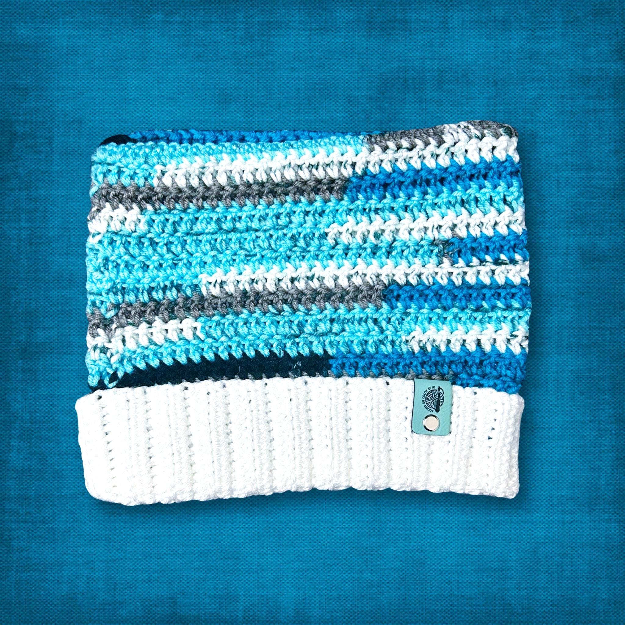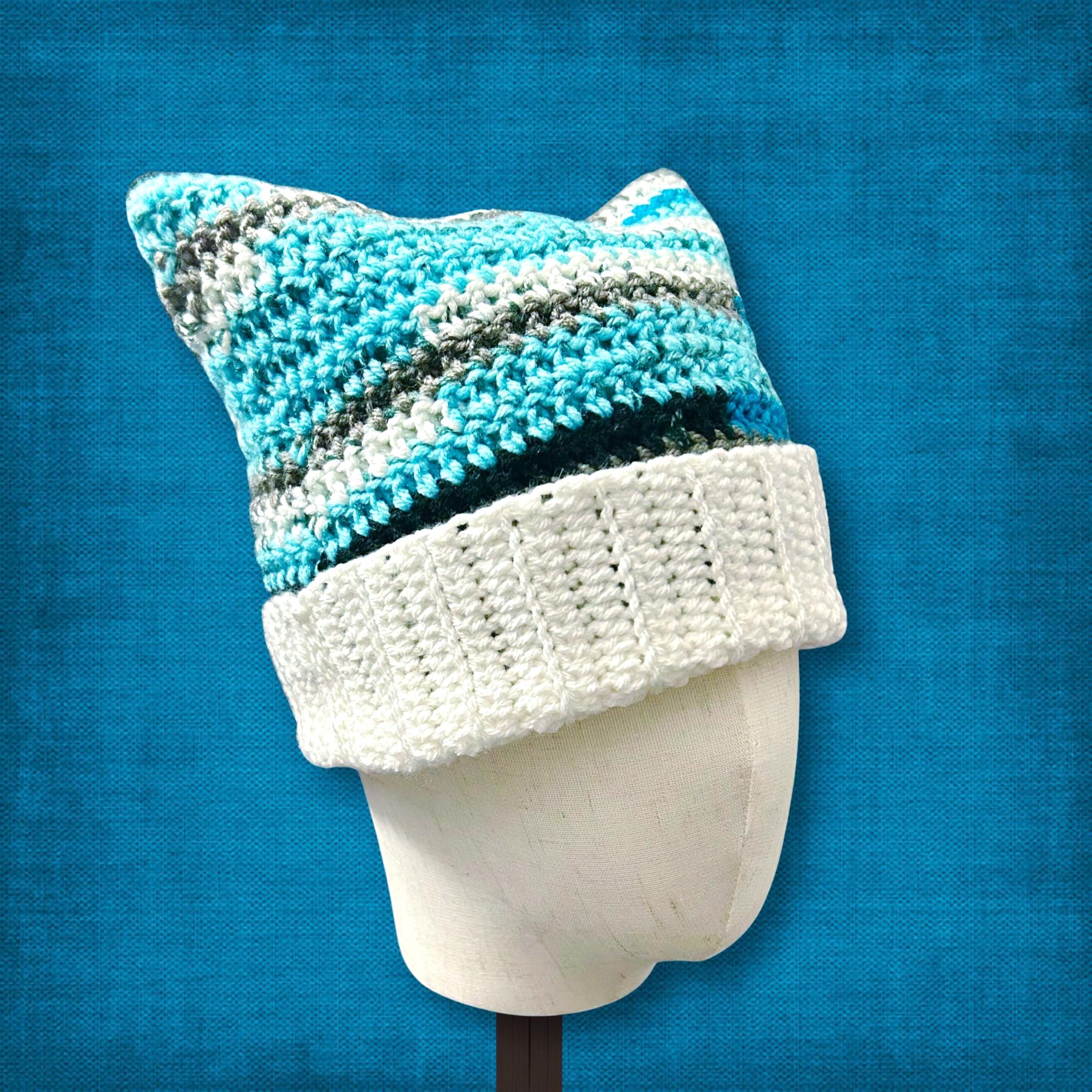 🟣 Aren't those cat ears adorable?! Talk about a winter statement piece! This cat ear beanie is sized for adults and is made to wear all season long. The colors include teal blue, bright royal blue, white, gray, and black. I used a different crochet stitch and color yarn on the flipped up border to give it more of a unique look. See photos for measurements and other details.