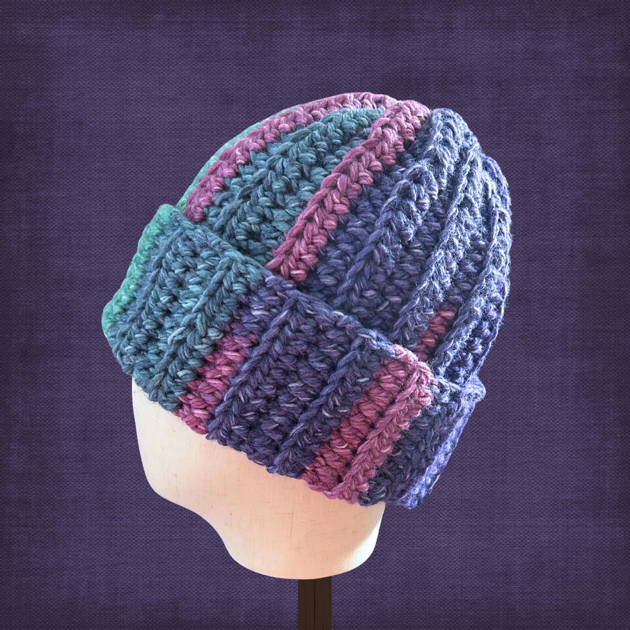 🟣 This hat reminds me of those to-go cups from the 80's. You know, the cups with the geometric design on the side? The colors include turquoise blue-green, deep purple, and mulberry purple-red. Adult large beanie (ribbing pattern stretches to fit 99% of people). See photos for measurements.
