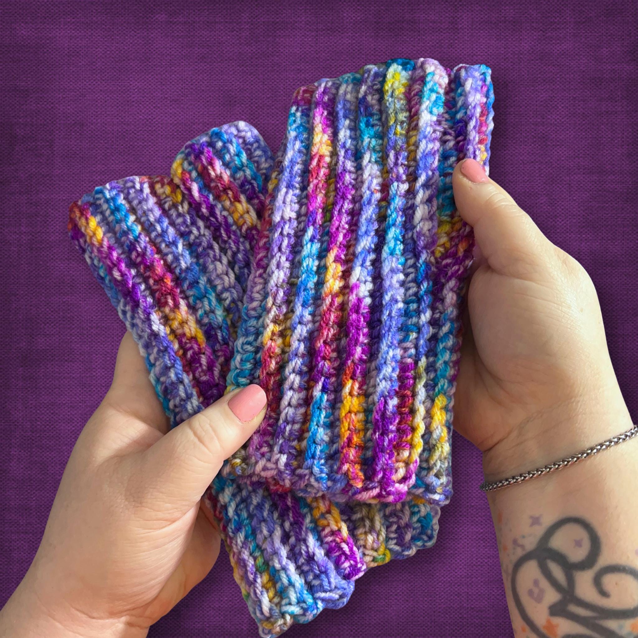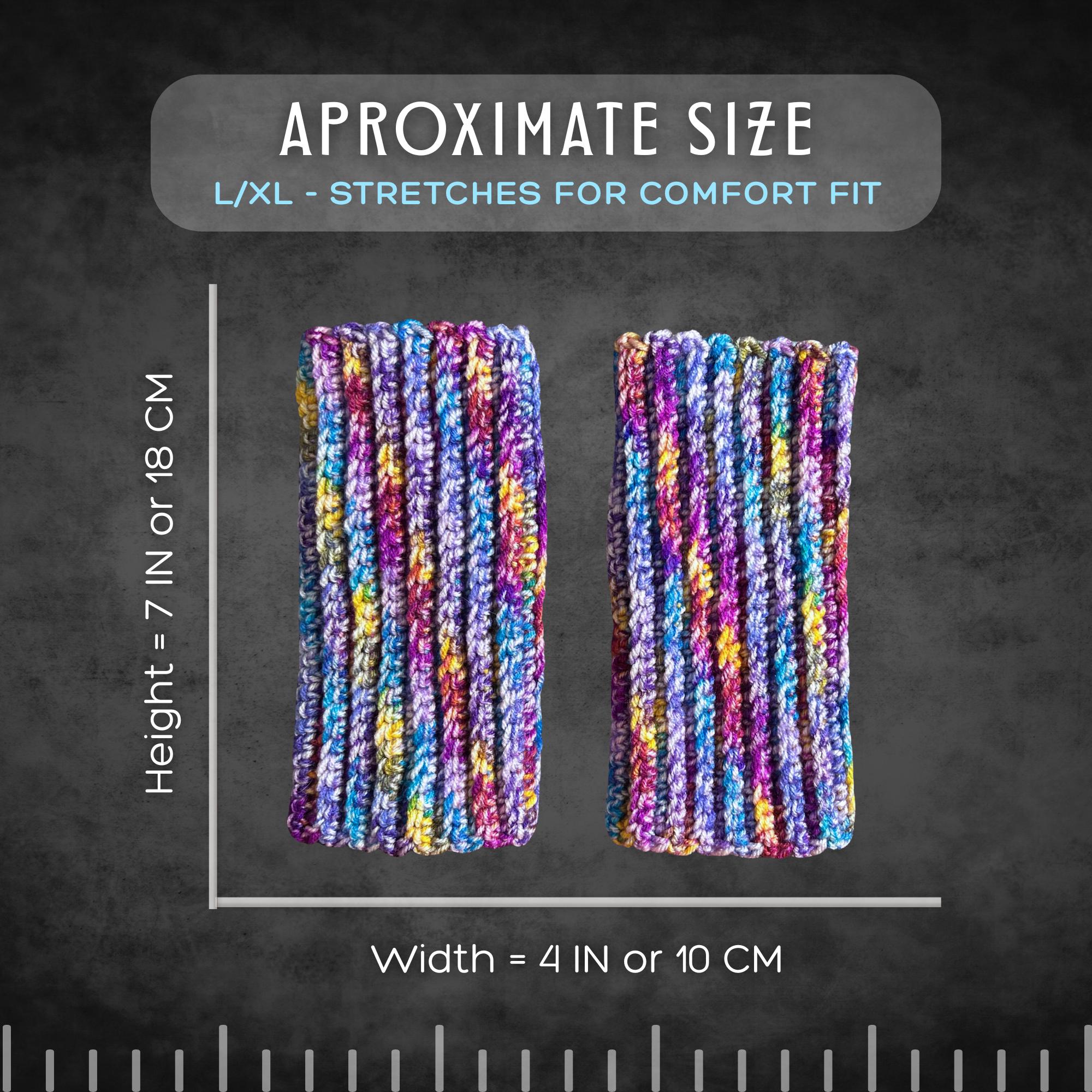 🟣 These super soft wrist warmers are an adult size L/XL. For reference, my wrists are 8.25 IN around. I used a ribbed pattern so the gloves have a comfort stretch when worn. They're multicolored and great for anyone with cold hands and wrists (like your friends who use computers or cell phones all day)! See photos for measurements.
