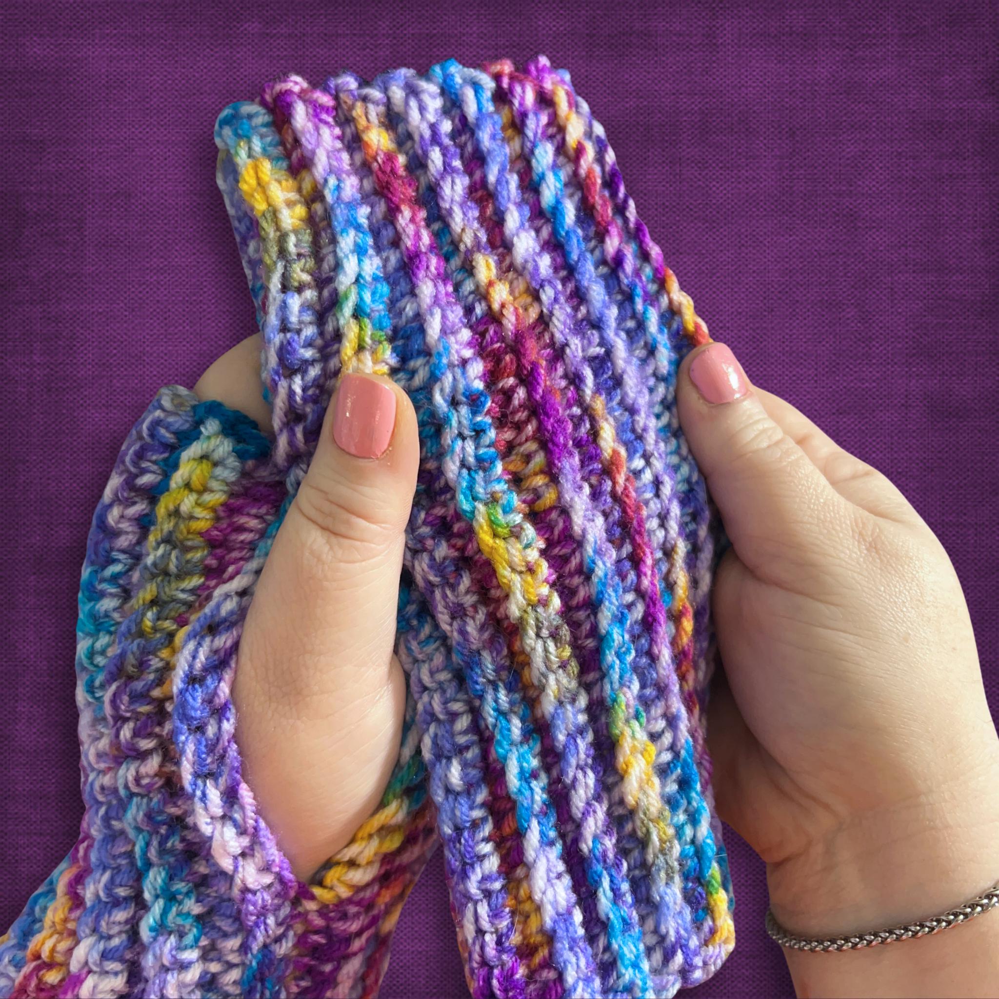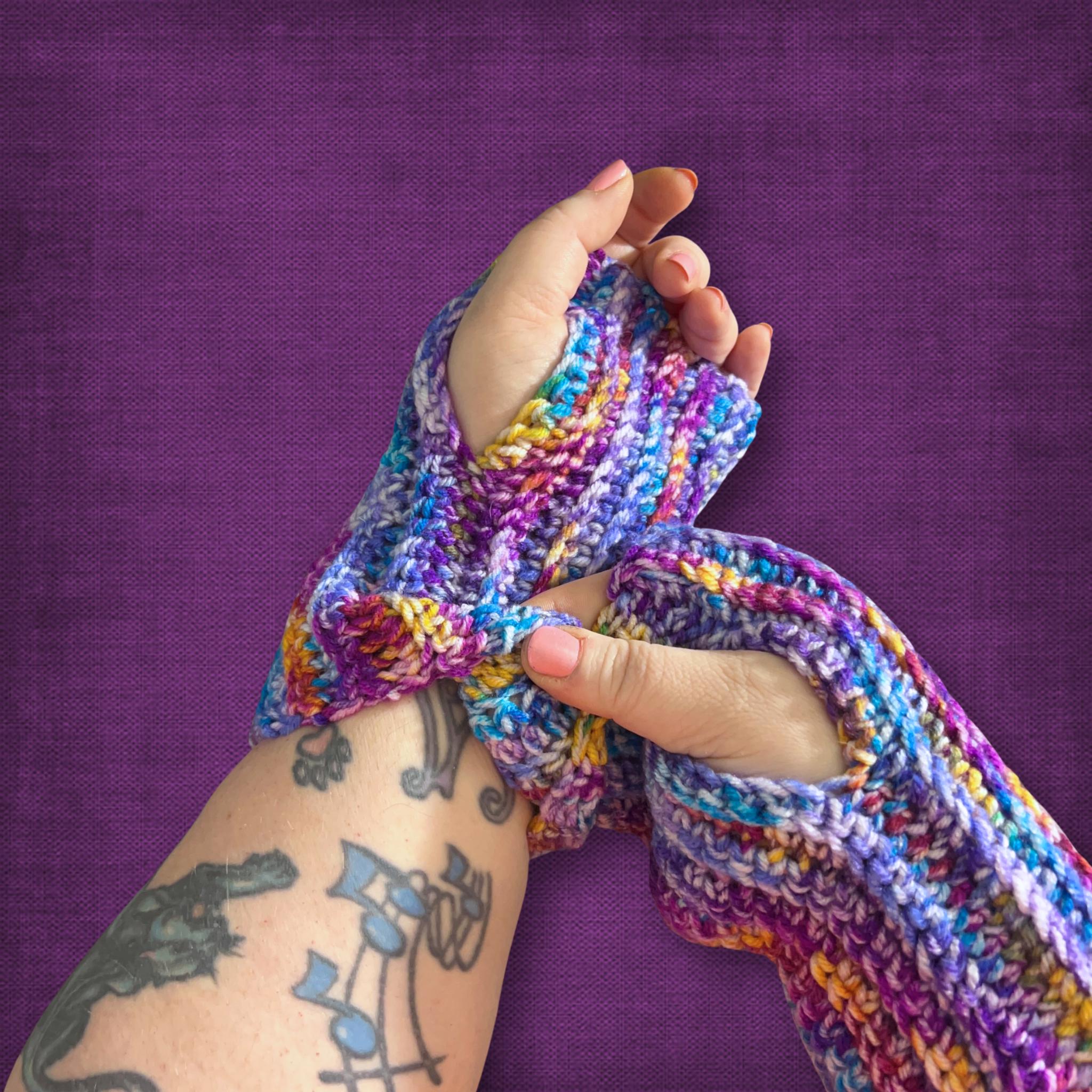 L/XL Wrist Warmers Purple Blue Multicolor Crocheted Fingerless Gloves For Large Hands