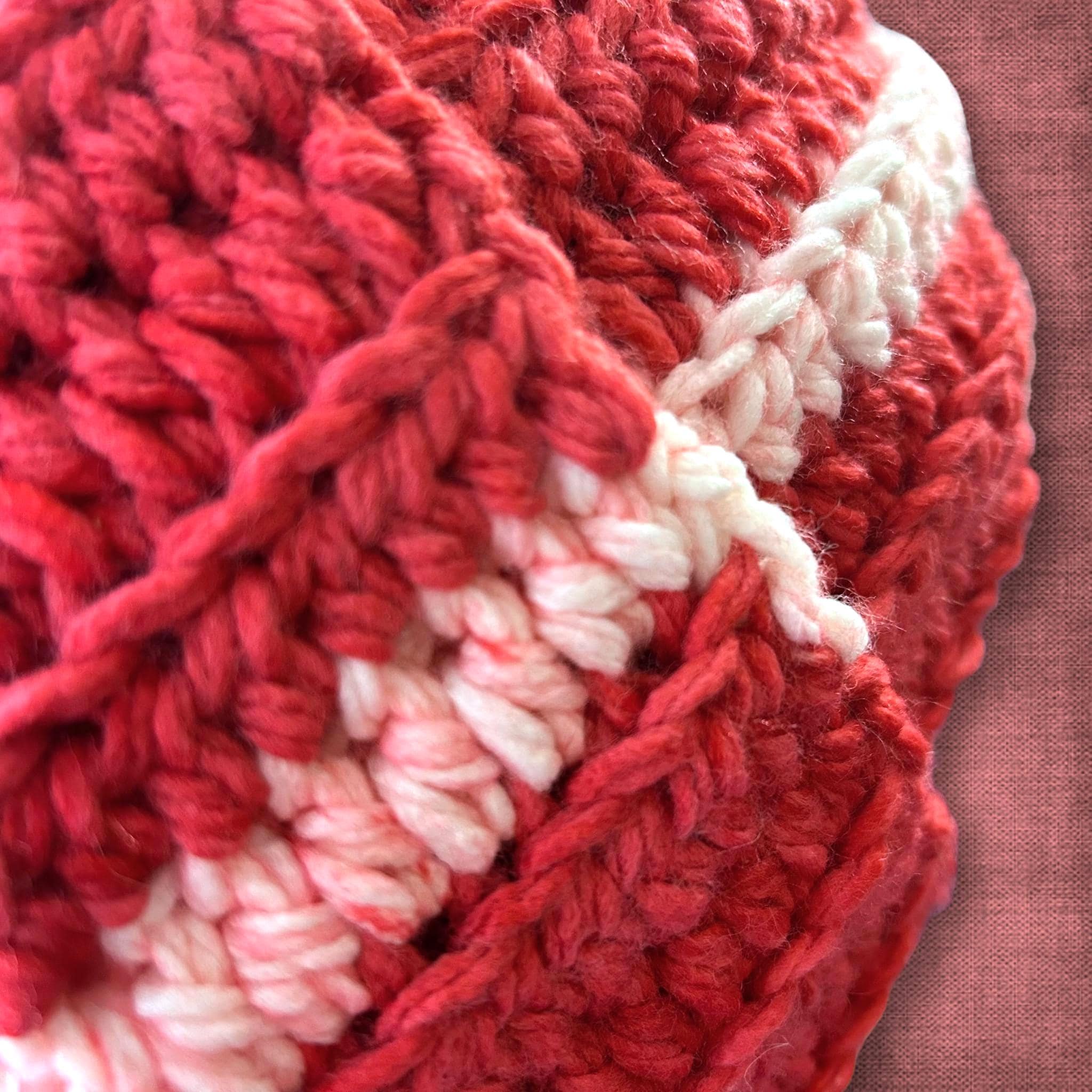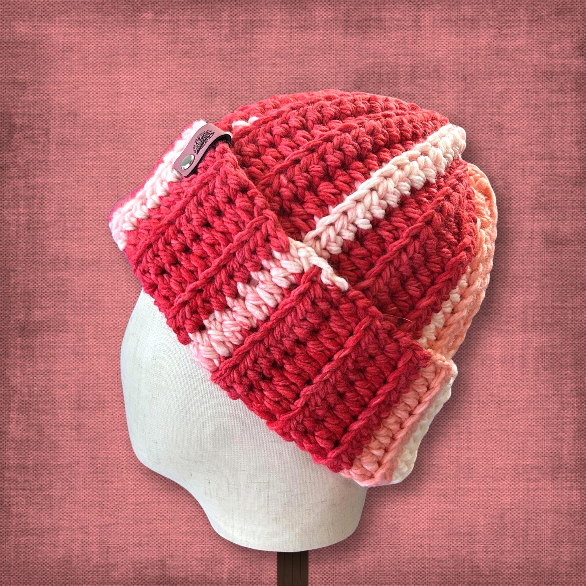 🟣 This beanie makes me think of Valentine's Day cookies with its color scheme. You'll find red, pink, white, and tan colors mixed into this hat. It's one of a kind! Adult L/XL beanie (ribbing pattern stretches to fit most people). See photos for measurements.