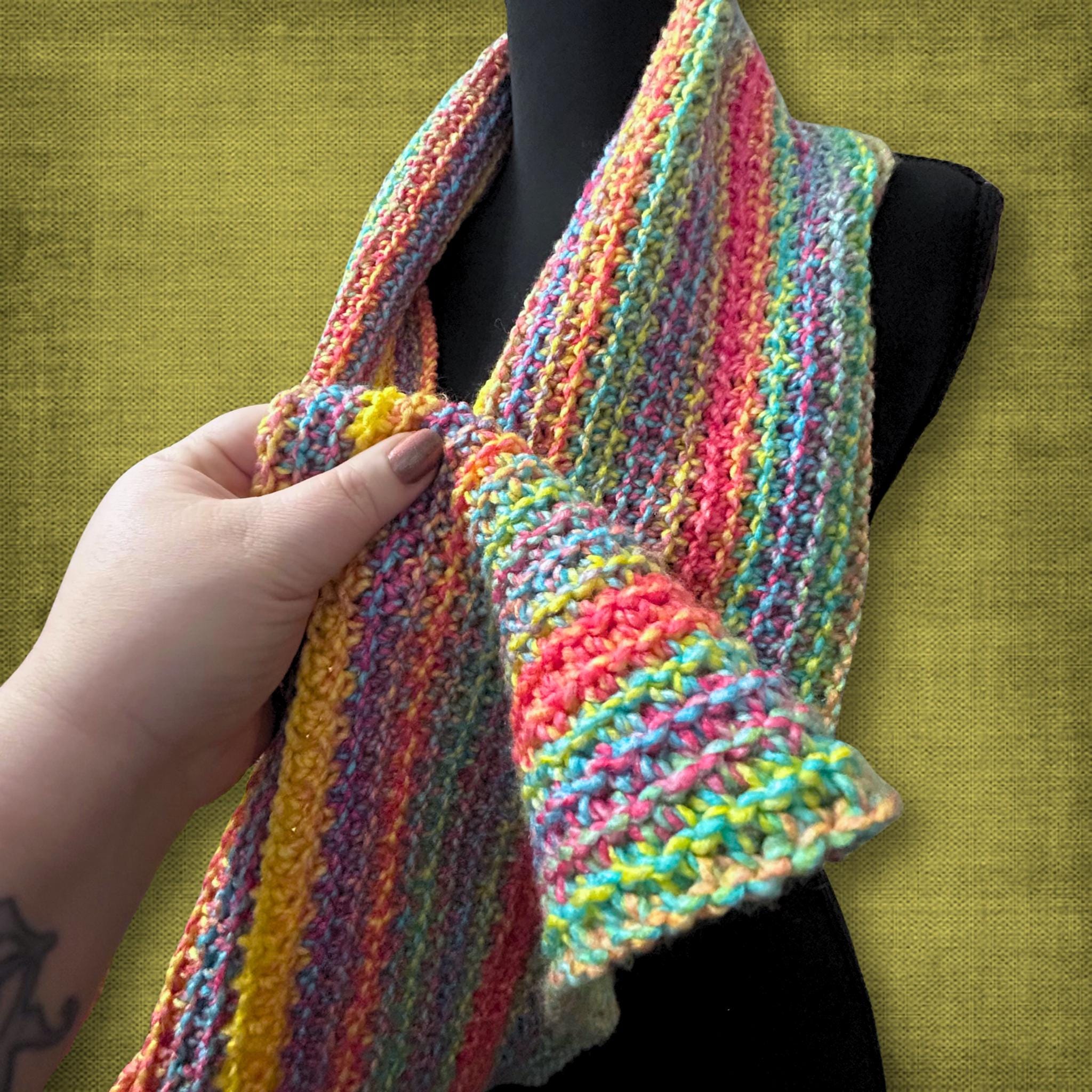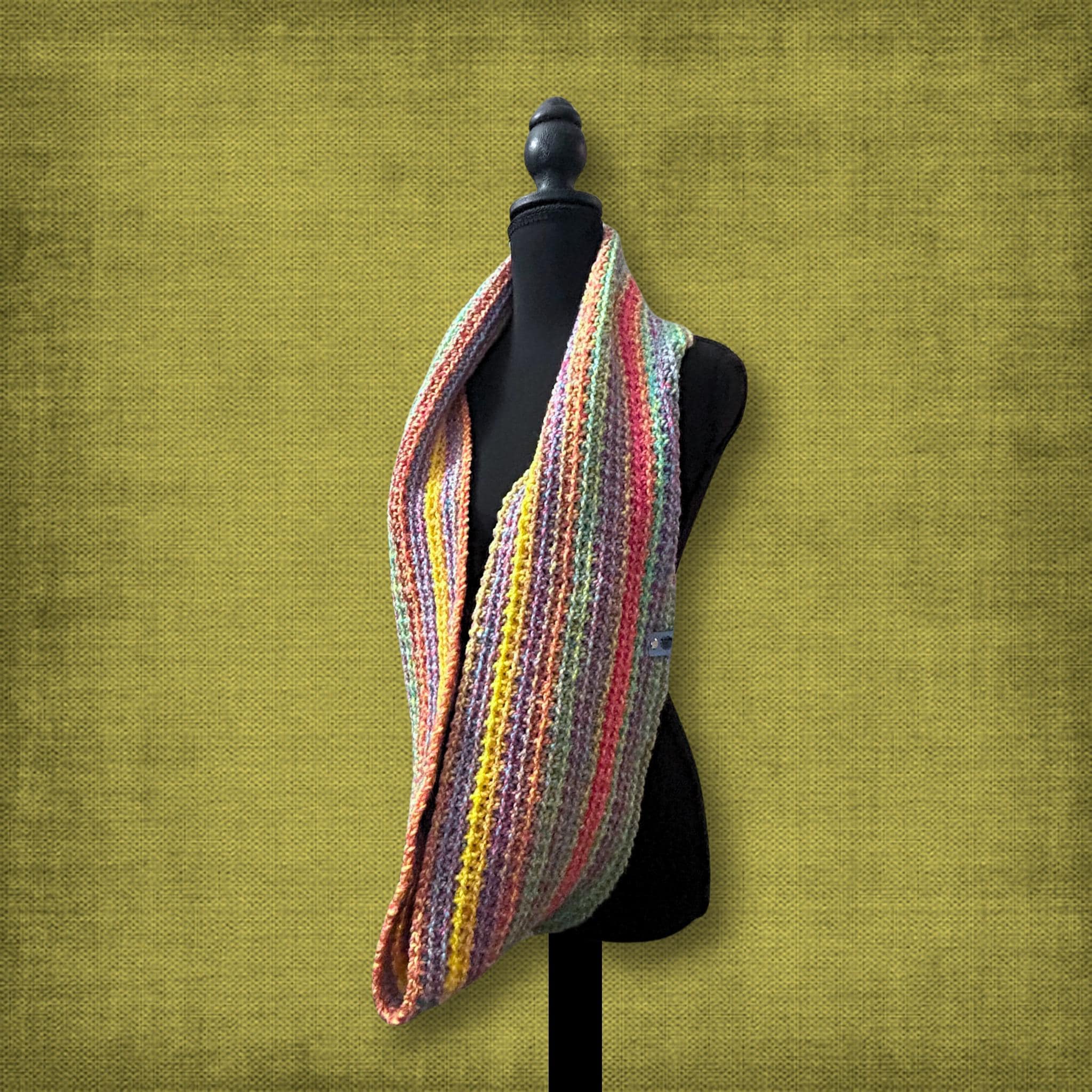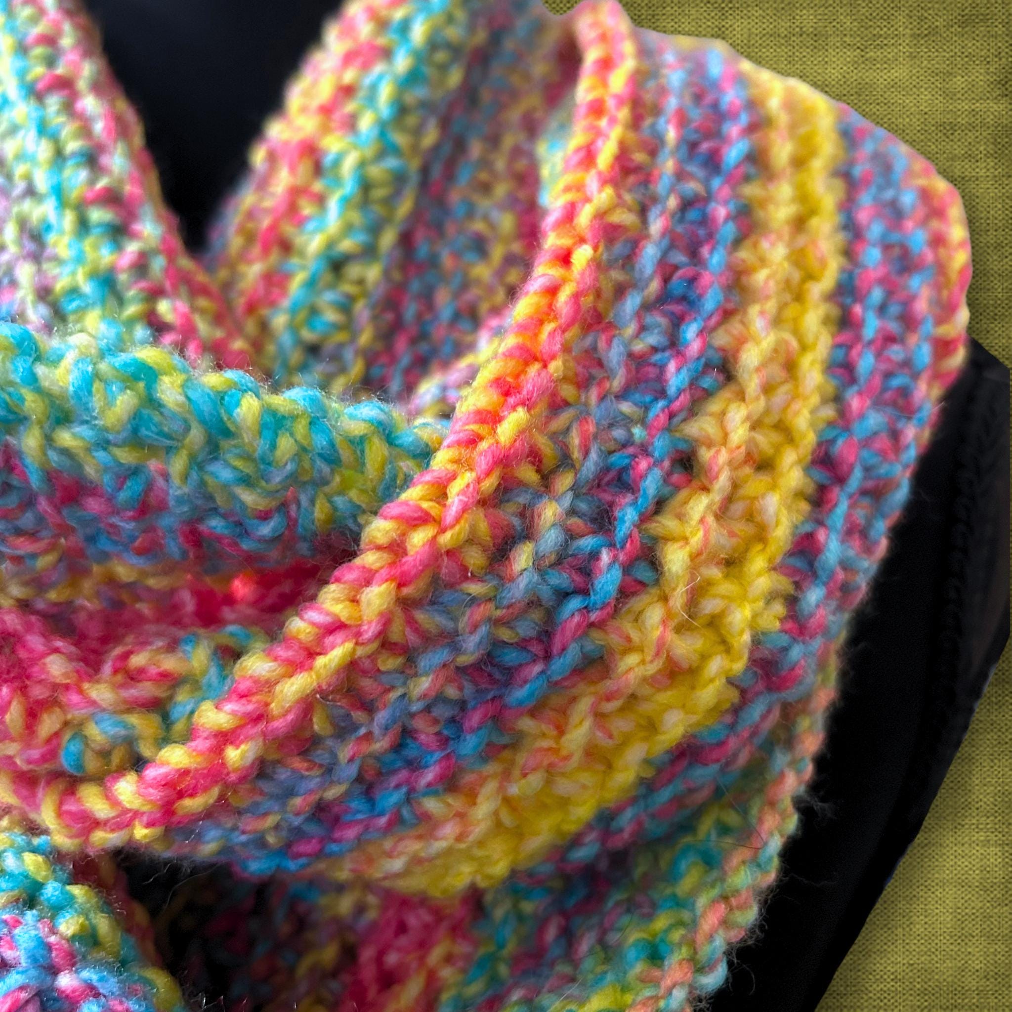 🟣 This bright and colorful infinity scarf was crocheted without leaving a seam. Pair it with any outfit because of all the colors within the scarf! It will fit both standard and plus sizes. It's also machine washable. See photos for measurements.