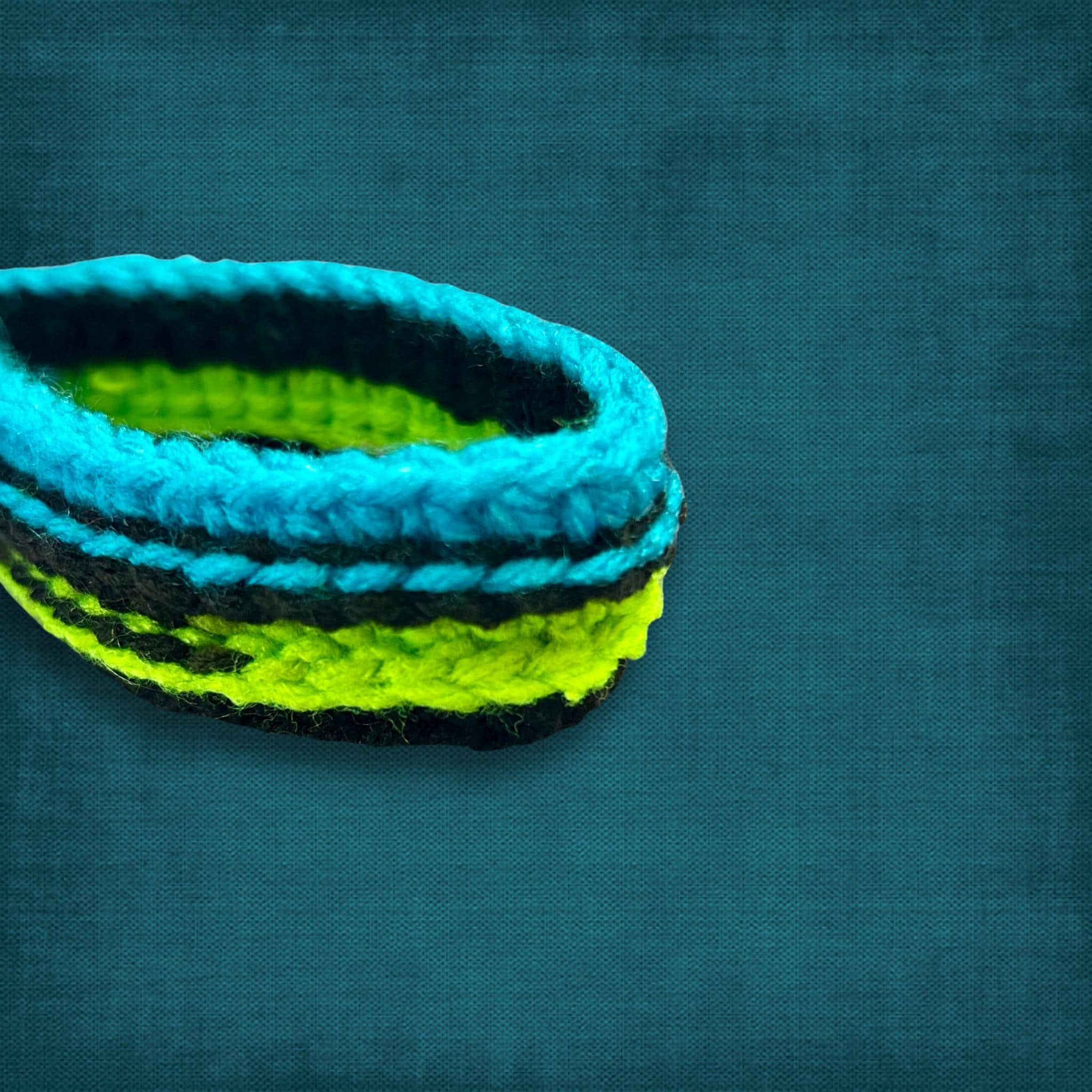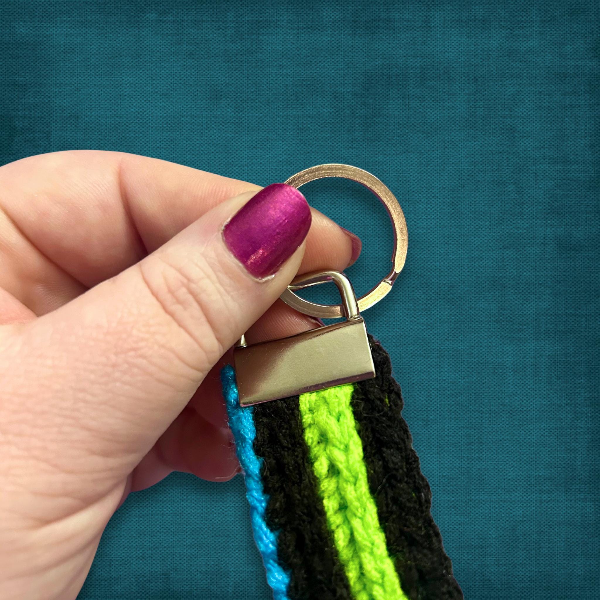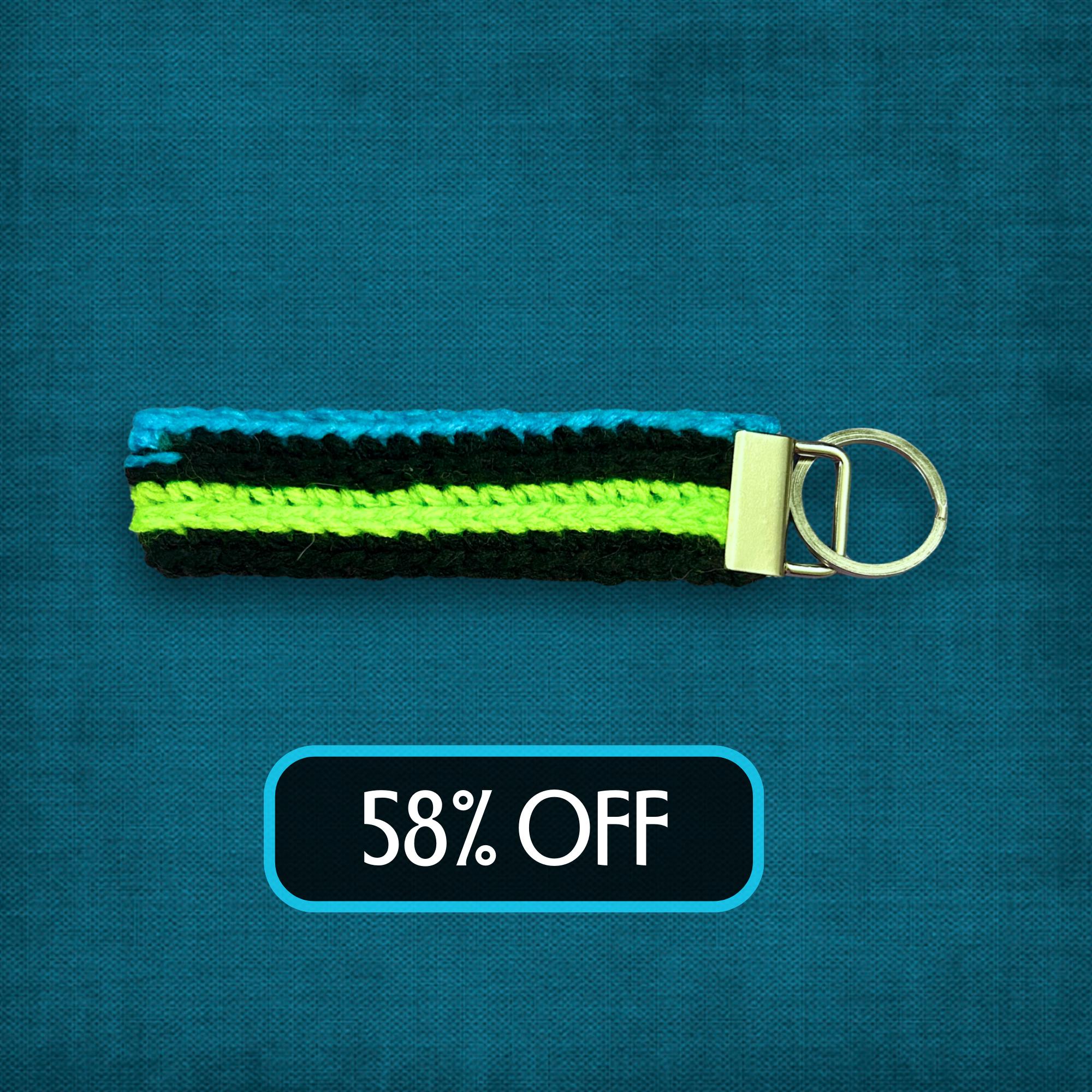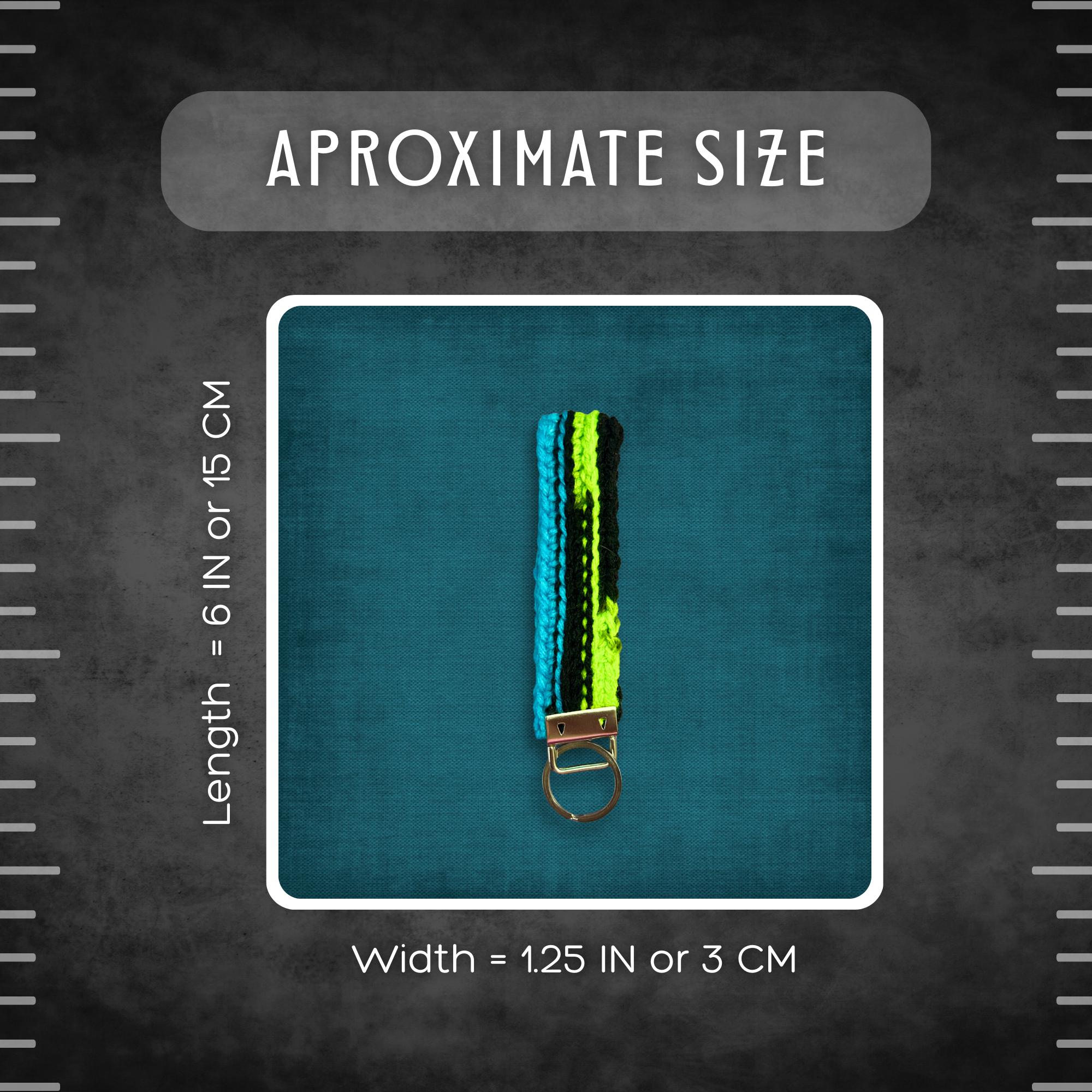 🟣 This wristlet keychain is bright and eye catching with its mix of neon blue and green with a deep black yarn. See photos for measurements. What a great gift for a new driver!