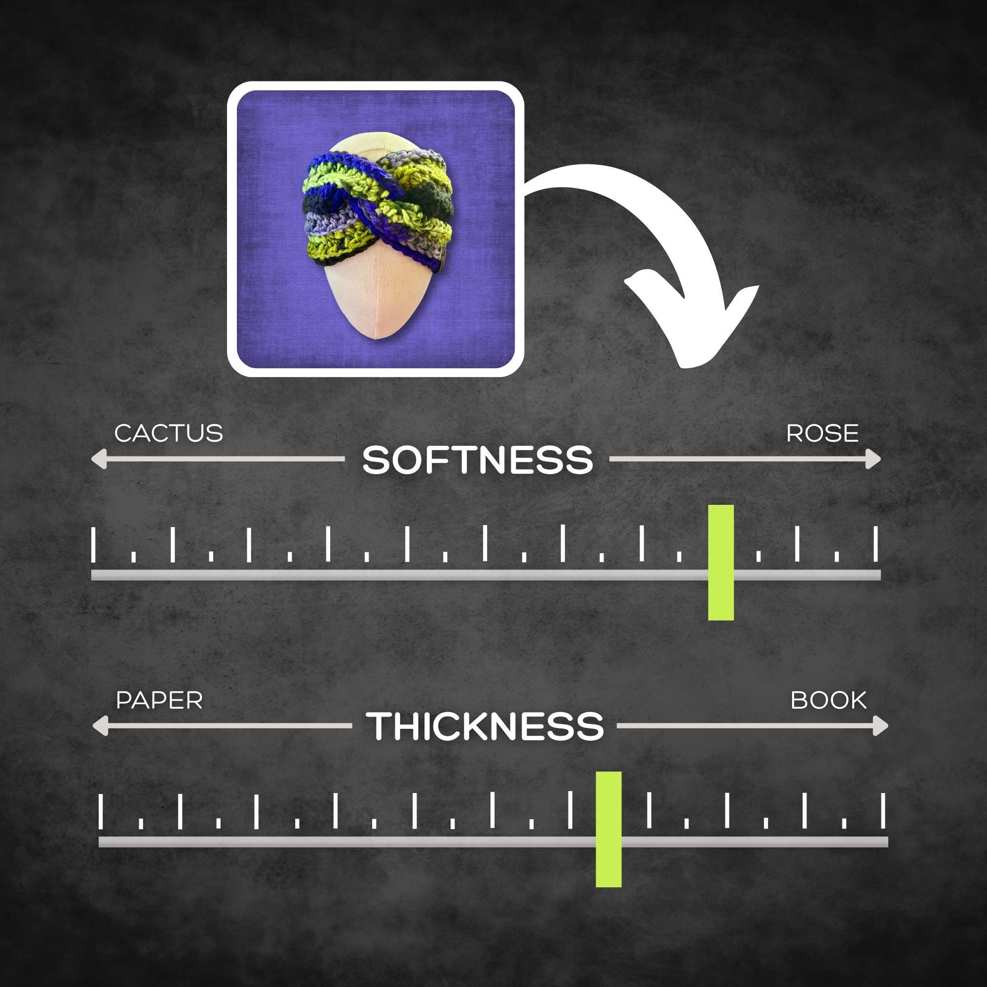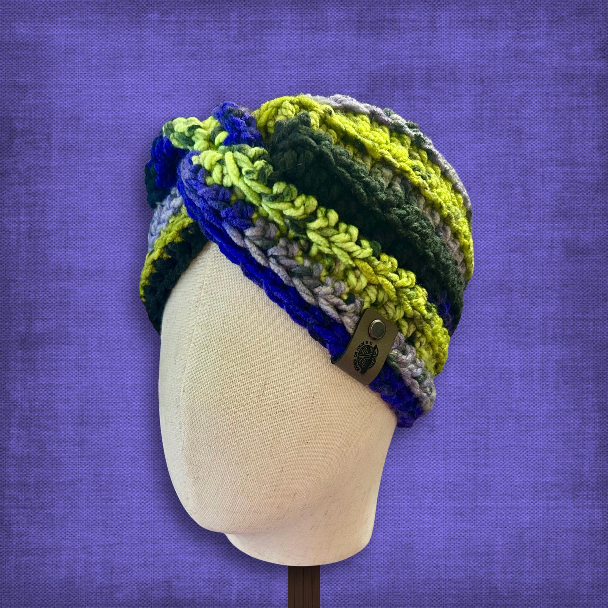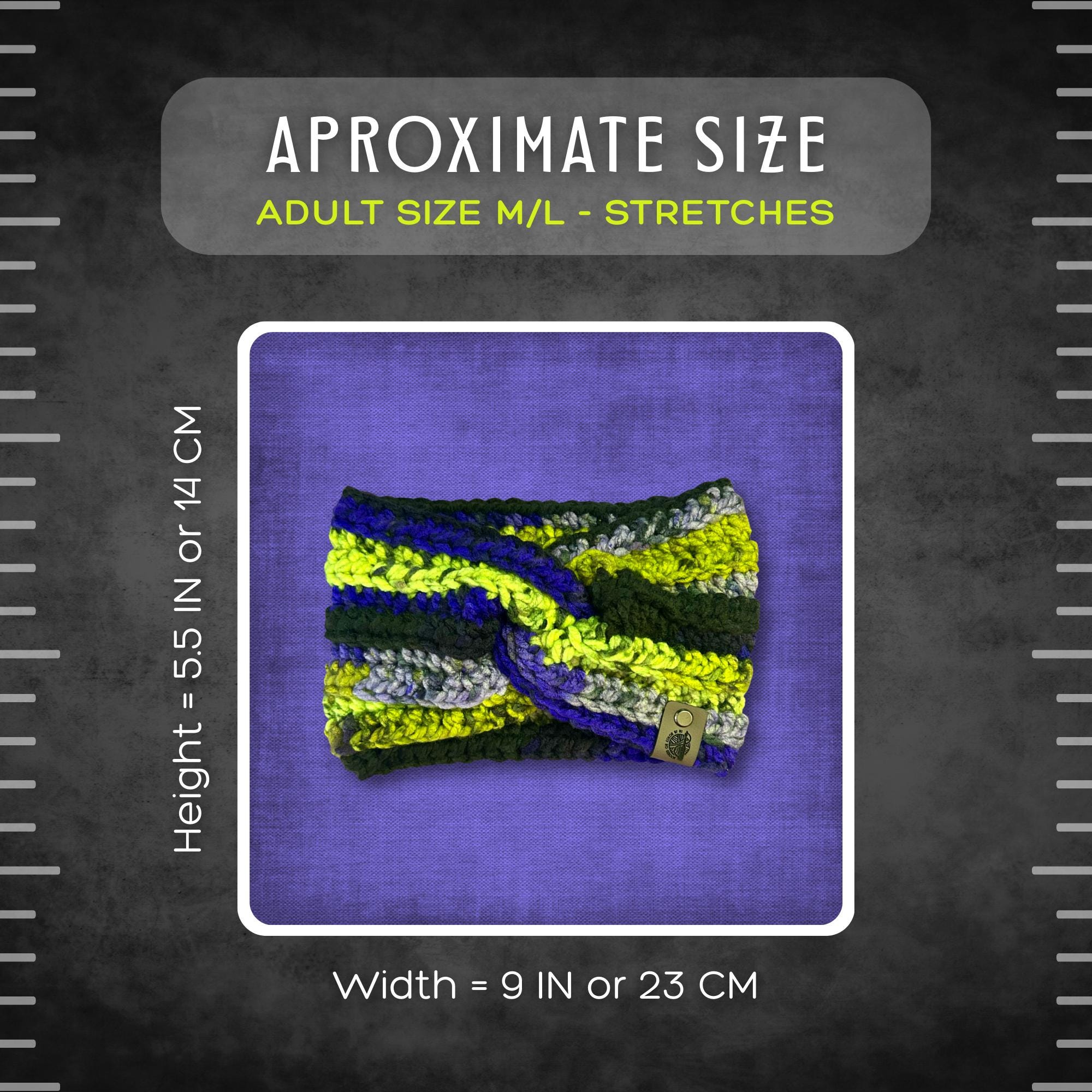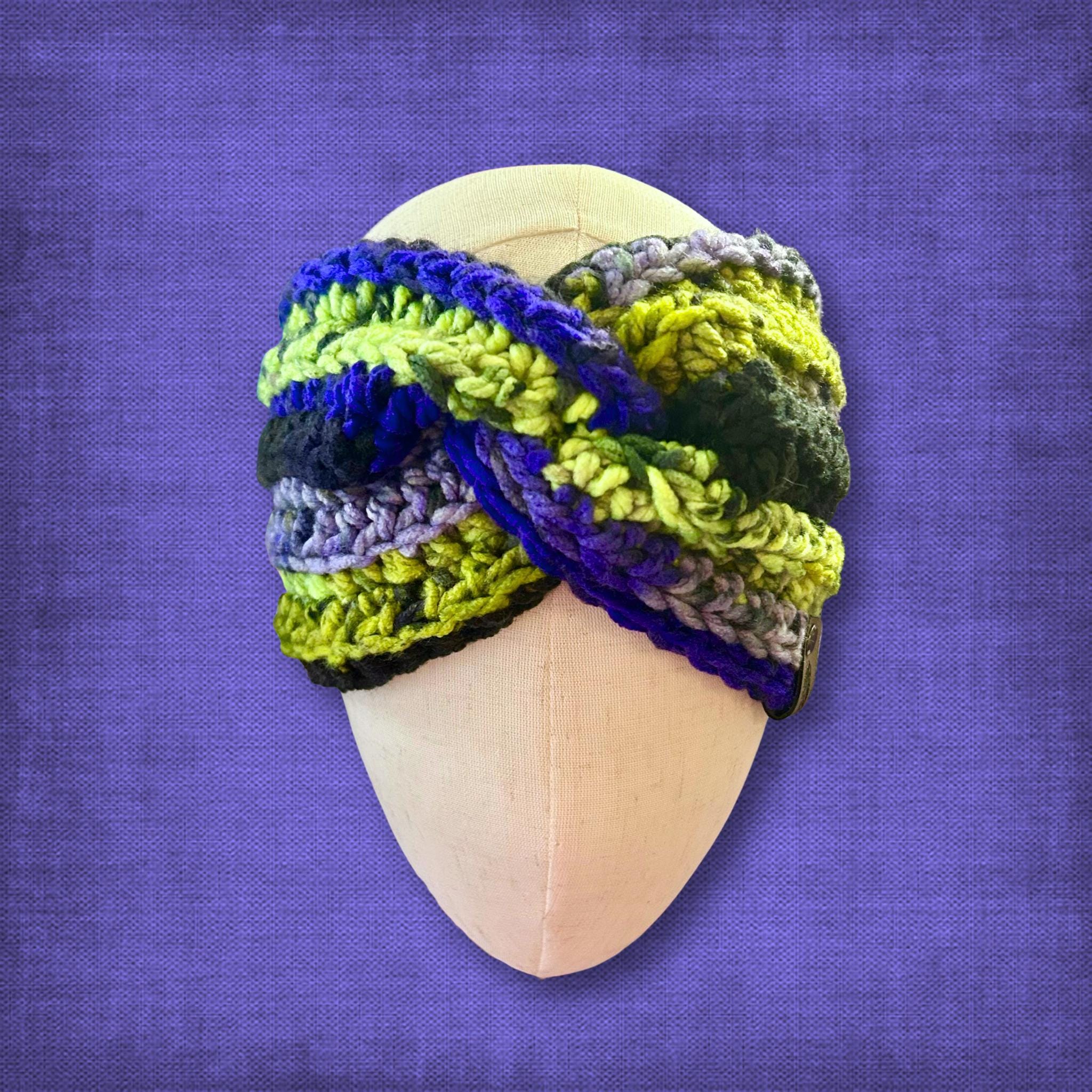 🟣 Keep those cold ears warm this winter with a vibrant knotted headband ear warmer! The colors include neon green, black, and various shades of purple. It reminds me of DC's Joker vibe. Adult medium/large ear warmer with some stretch. See photos for measurements.